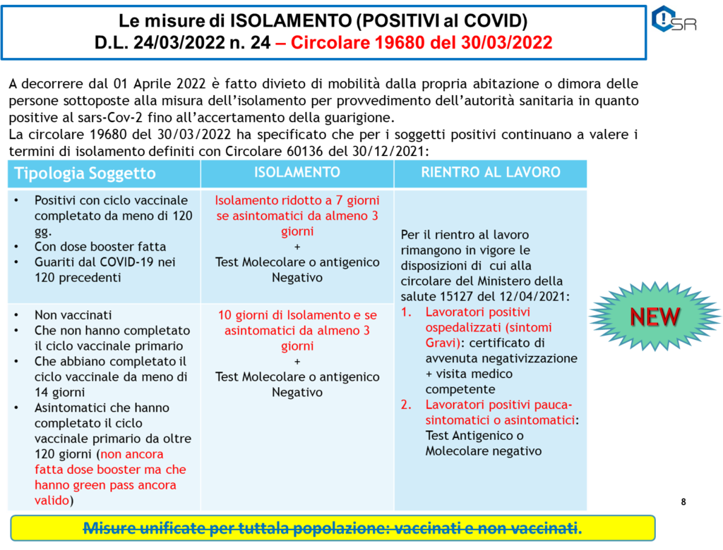 L’isolamento dei soggetti positivi al COVID torna ad essere differenziato per i soggetti che hanno completato il ciclo vaccinale (con Booster) e per i non vaccinati.